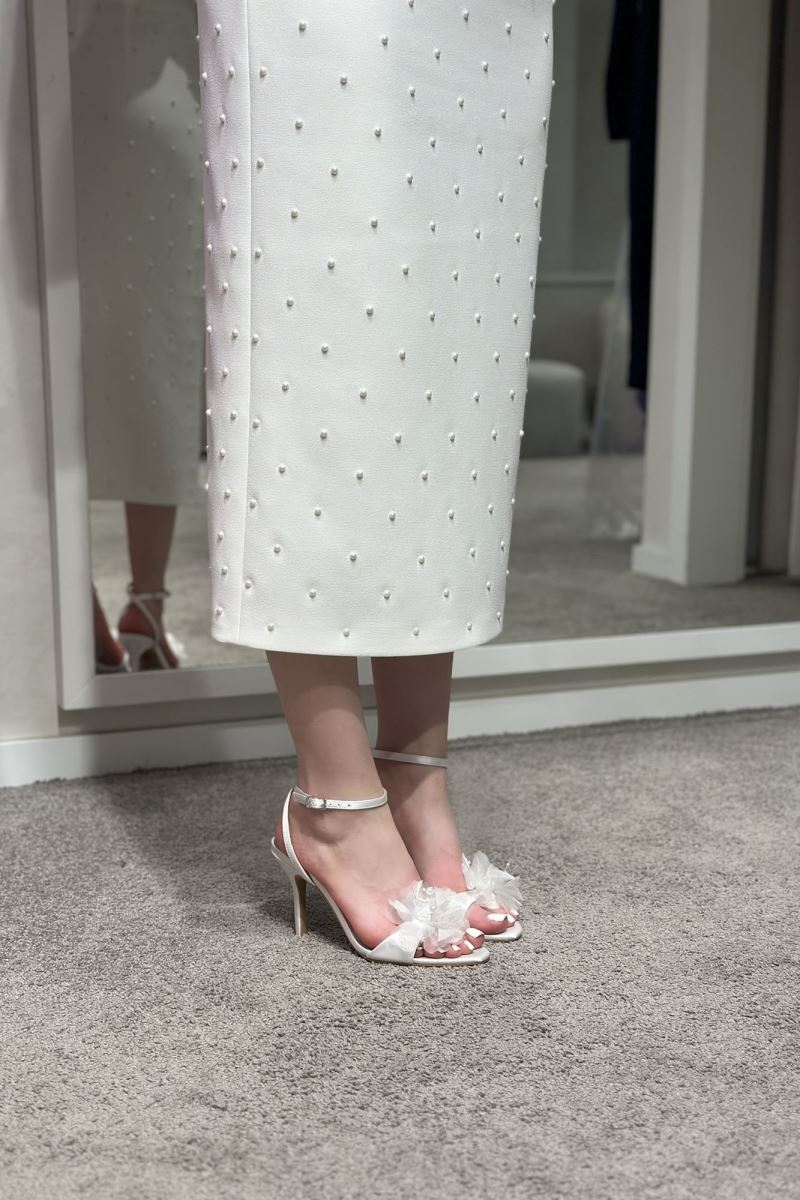 Gökyüzünün parıltısını topuklarına taşıyor. 10 cm’lik ince topuğu ile zarafet ve özgüvenin buluştuğu nokta. Saten kumaşıyla ışığı zarifçe yansıtır, her adımında dikkatleri üzerine çeker.