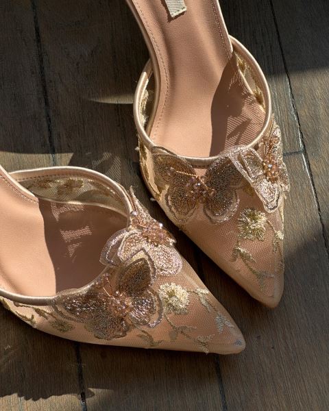 Çiçek dokulu tül önyüzünü sivri kesimle tamamlamış, kelebeklerin sardığı gizli bahçe…